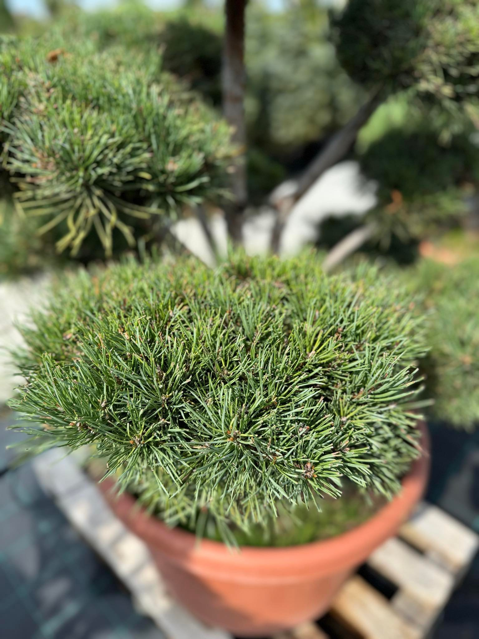Formuoti pušų medžiai ir bonsai – išskirtiniai, kruopščiai prižiūrėti augalai, kurie suteikia sodui prabangos ir išskirtinumo.