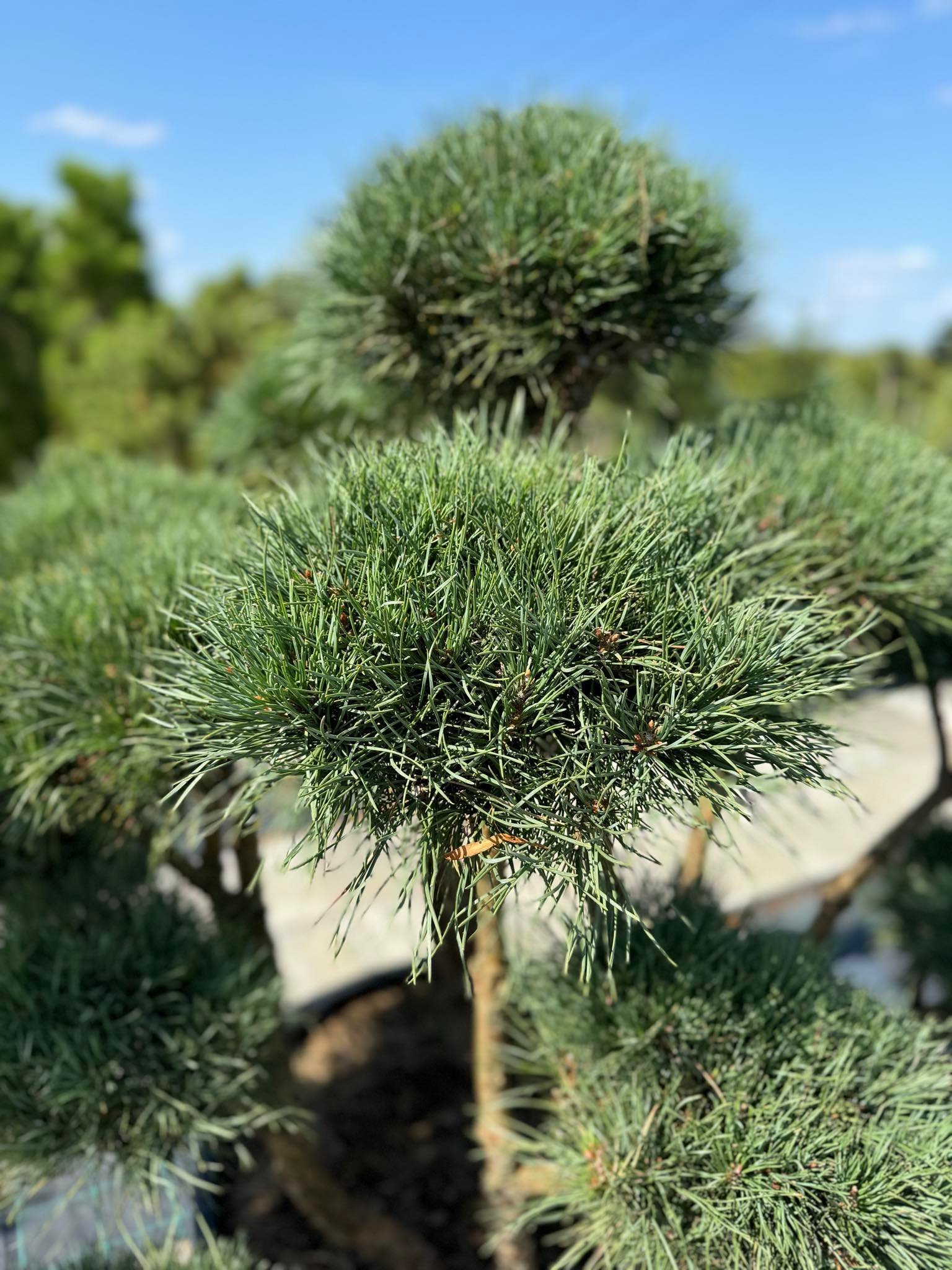Formuoti pušų medžiai ir bonsai – išskirtiniai, kruopščiai prižiūrėti augalai, kurie suteikia sodui prabangos ir išskirtinumo.