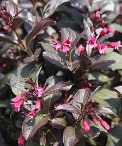 Veislė Victoria suteikia nuostabų kontrastą sode sodria violetinei-bronzine lapija su rožiniais trimito formos žiedais.